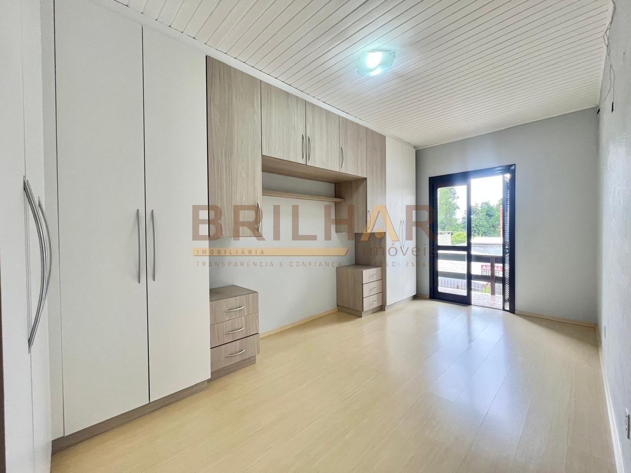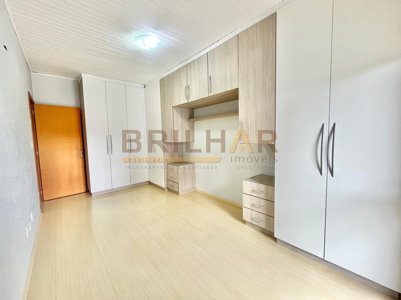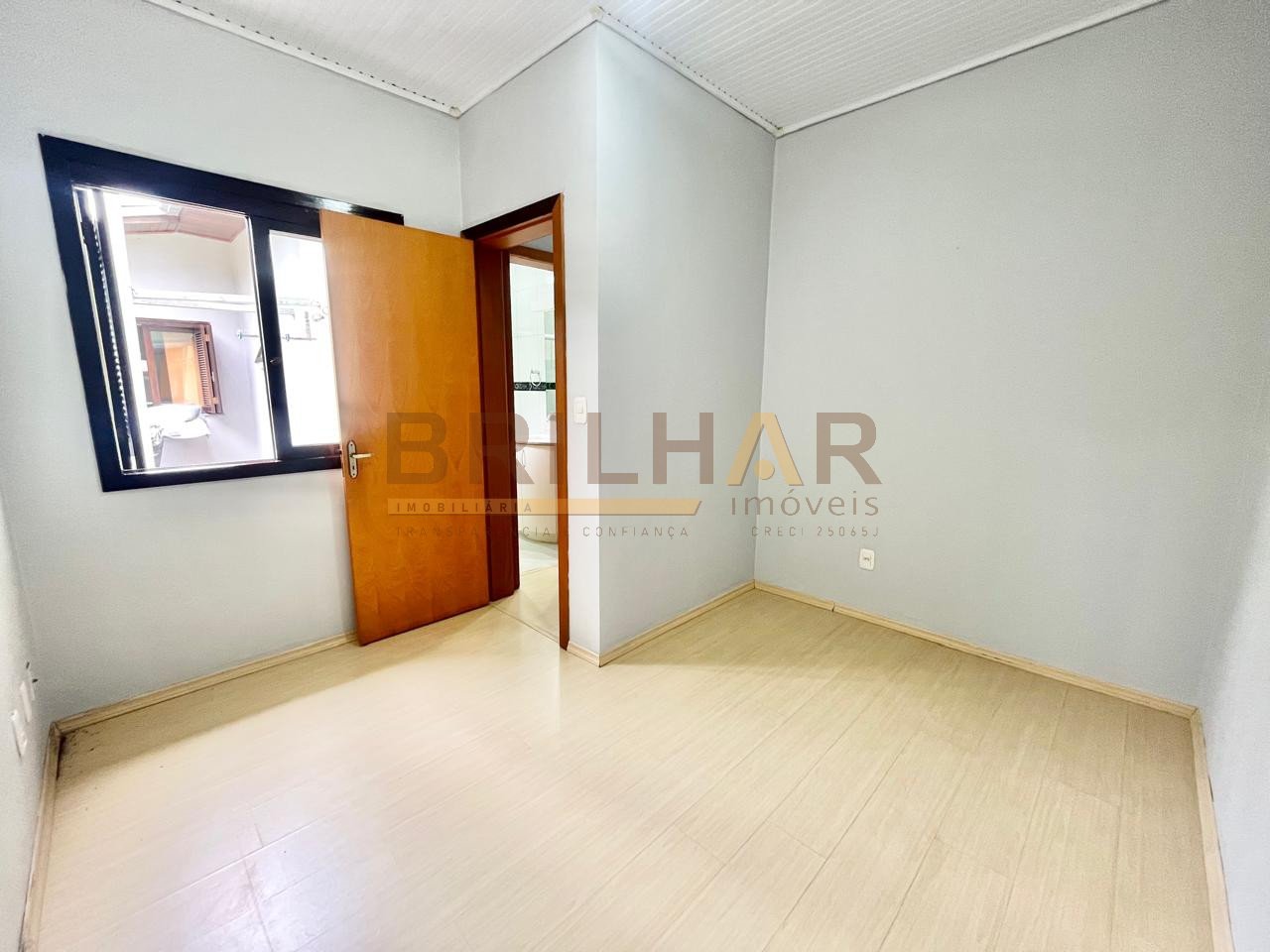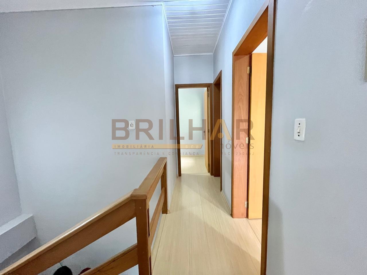 O piso nos quartos é laminado, o piso na sala, cozinha e área de serviço é cerâmico. A garagem fica no corpo da casa com portão eletrônico. Possui instalação de água quente.